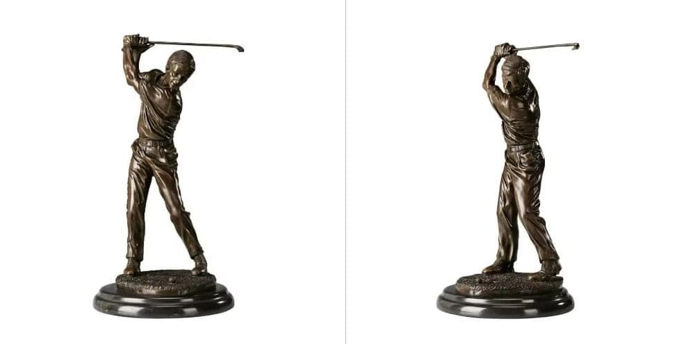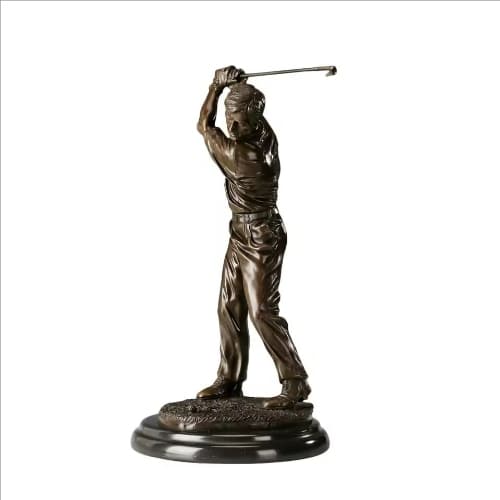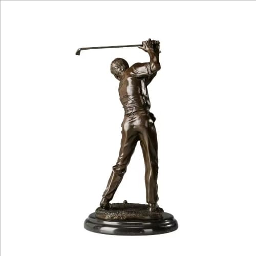 This sculpture meticulously captures a golfer at the peak of his backswing, just moments before impact. Cast in high-quality bronze with a classic deep patina, the piece showcases exceptional attention to detail: from the tension in the player’s muscles and the realistic folds of his attire to his intense focus on the ball. Mounted on a solid circular marble base, the figurine embodies the precision and elegance of golf, making it a masterpiece of both athletic and artistic expression.