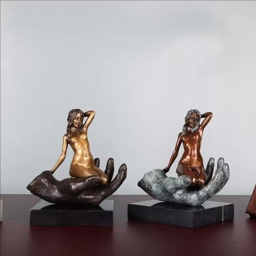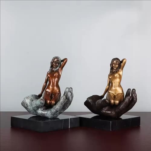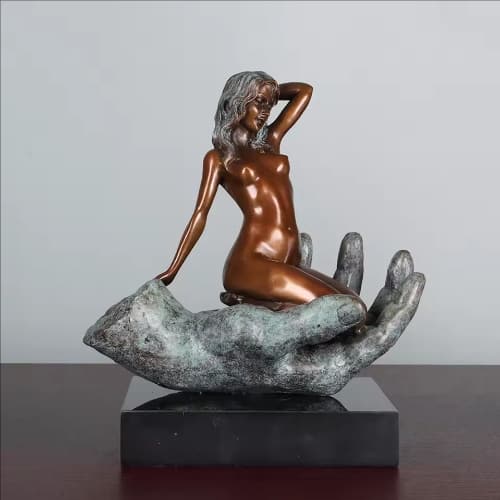 Crafted using the traditional "lost-wax" casting method, this sculpture features an elegantly proportioned nude woman seated gracefully within a massive, weathered male palm. The artist employs a striking contrast in patinas: the female form glows with a warm, polished bronze finish symbolizing vitality and purity, while the giant hand is finished in a deep verdigris green, resembling weathered stone or ancient ruins. This visual juxtaposition highlights the delicacy of the subject and imbues the piece with a sense of timeless philosophical depth.