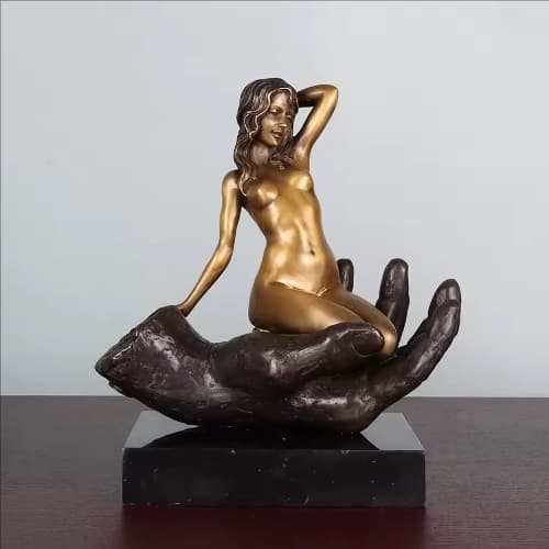 Nude Woman in Palm Bronze Sculpture Erotic Art Sexy Bare Female Statue Naked Figurine Collection Decoration