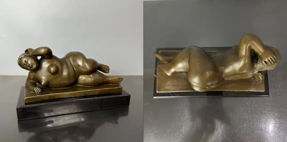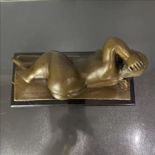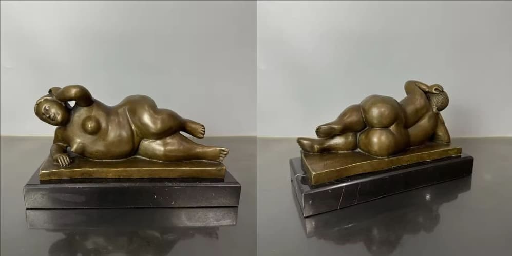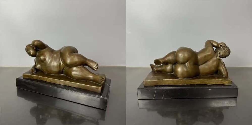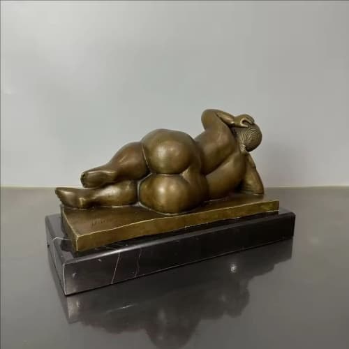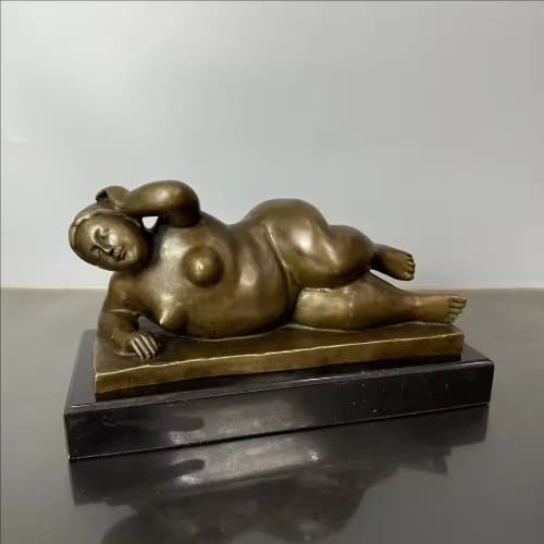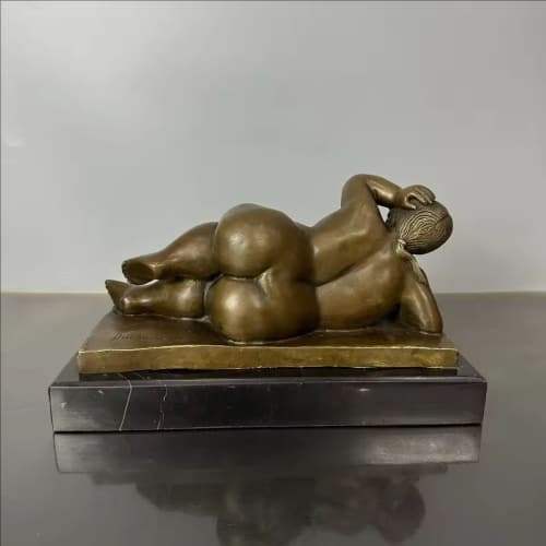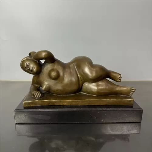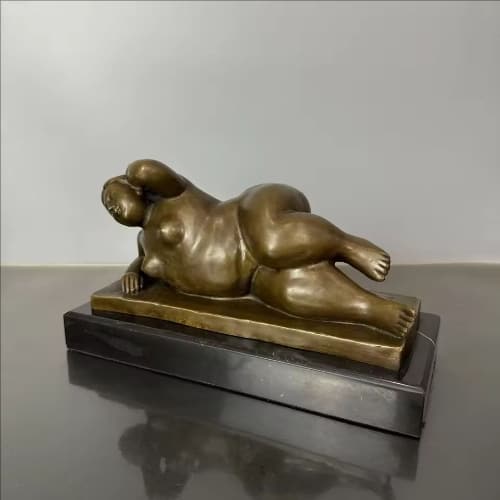 This bronze sculpture portrays a reclining woman with exaggerated, voluminous forms that celebrate fullness, calmness, and sensuality. Botero's signature aesthetic transforms the human body into a symbol of confidence and quiet elegance. The relaxed pose and gentle expression convey a sense of leisure, intimacy, and timeless beauty, making the piece both playful and sophisticated—an artistic statement that challenges conventional ideals of proportion and embraces individuality.